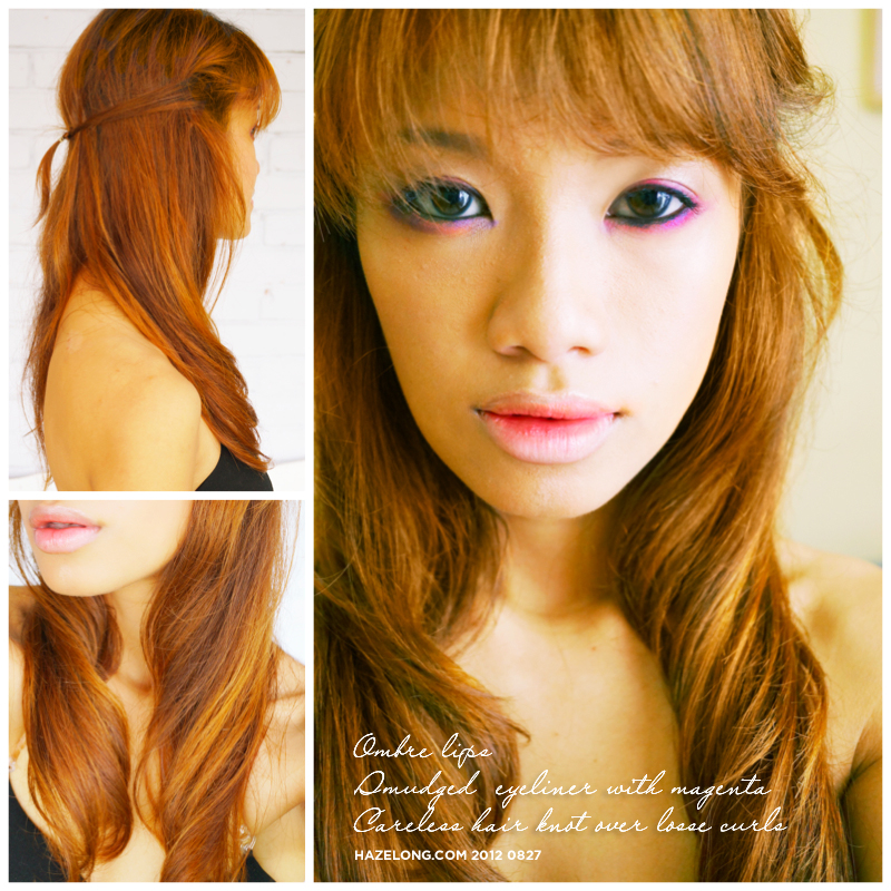 Nude lips. Smudge hot pink in the center of your lips.