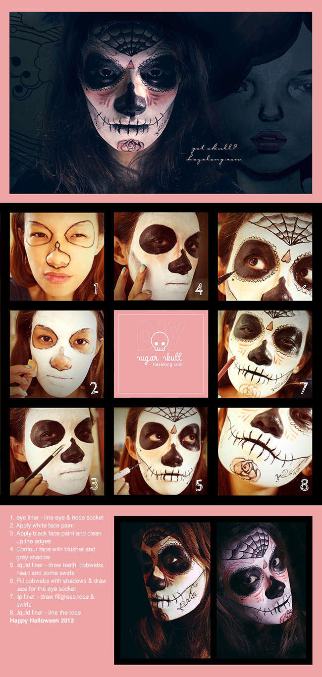 - Contour face with blusher and gray shadow. White face paint can really make your face look flat so we are going to do some contouring here. Use bronzers or blushers on the side of your nose and below the eye sockets. Give your cheek a sunken skull look with grey shadow.